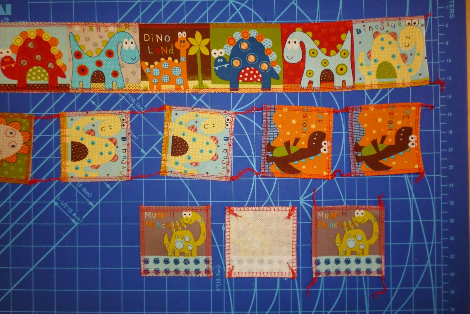 Pásy obšijeme a následně rozřežeme na jednotlivé obrázky. Obrázky postupně obšijeme na dalších stranách. Mezi obrázky necháváme cca 4 cm švu. Poté rozstřihneme na jednotlivé obrázky – stříháme uprostřed volného švu, konce zahneme do rubu (z důvodu, aby se nepáral overlockový steh).
