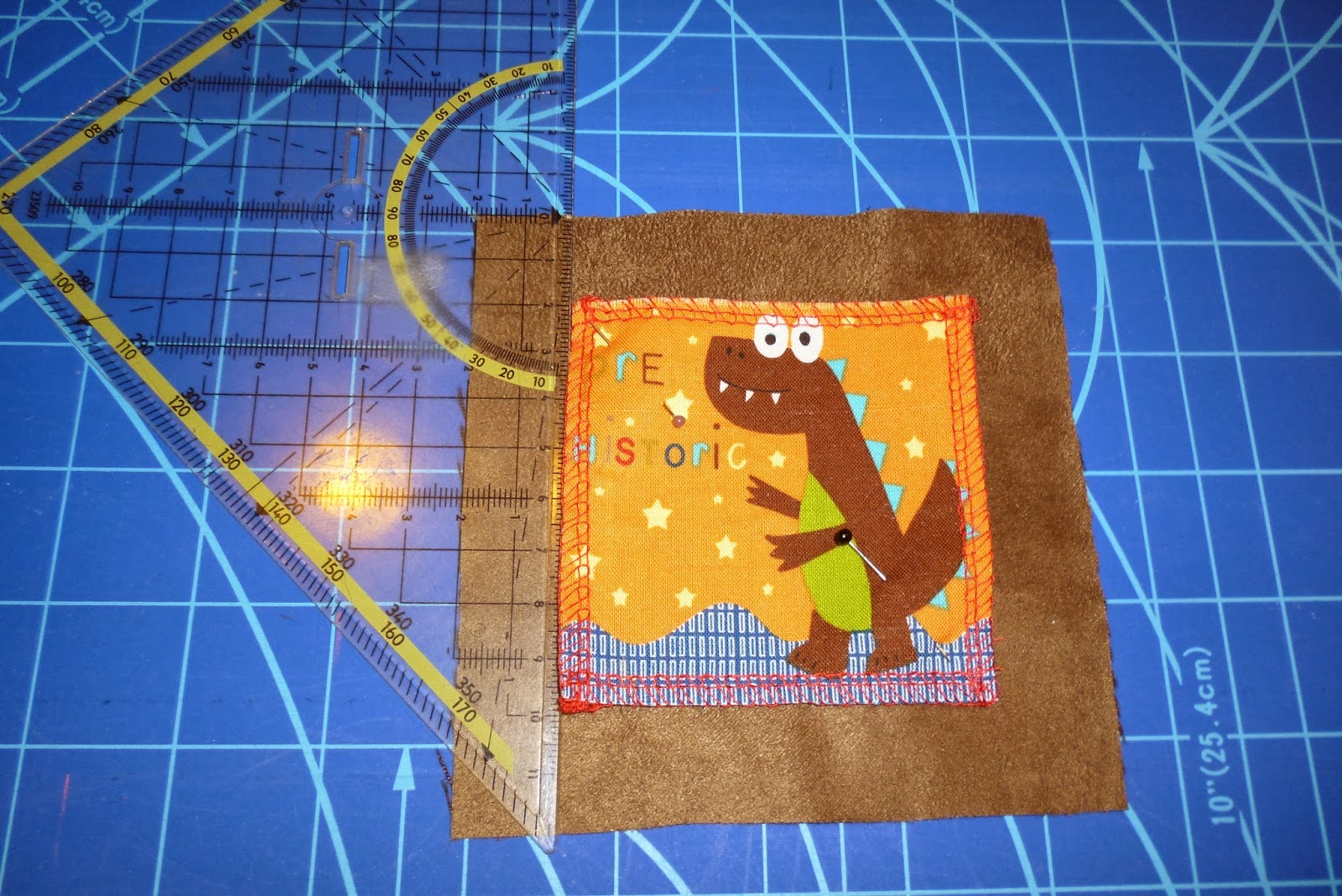 Podle zvolených velikostí našpendlíme motiv na základní látku. Já mám motiv 8 x 8 cm, látku 12 x 12 cm, proto špendlím ve vzdálenosti 2 x 2 cm od rohu – použijeme pravítko se značkami. Opakujeme na všechny čtverečky.