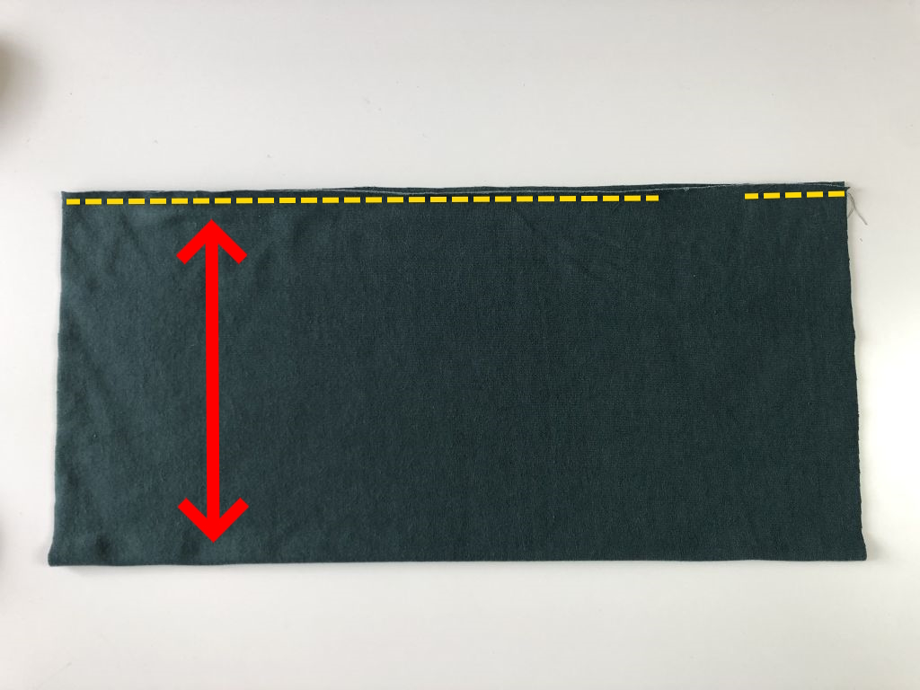 Najdeme směr, ve kterém látka více pruží a v tomto směru složíme čtverec látky na polovinu. Lícová strana je uvnitř. Po složení bude látka více pružit ve směru naznačeném červenou šipkou. Srovnáme na sebe hrany a na šířku patky (9 mm švový přídavek) hranu sešijeme. Přibližně v 1/4 necháme cca 7 cm nesešitých, jako protáčecí otvor.