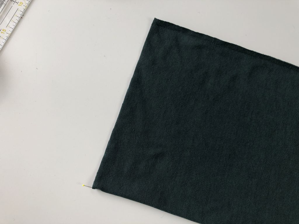 Do ohybu naproti švu si píchneme špendlík. Tím si označíme střed. Uděláme to tak na obou koncích čepice.