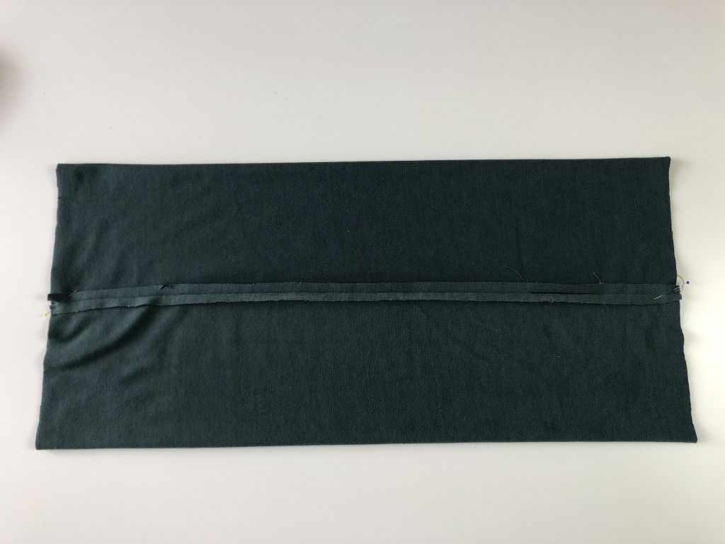 Šev umístíme na střed sešitého tunelu. Pomůžeme si označeným středem z minulého kroku.