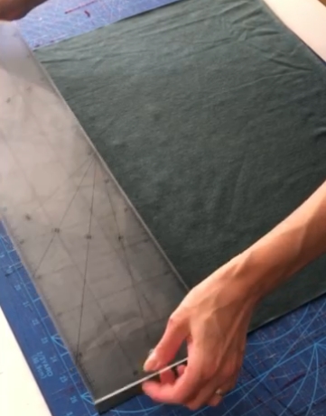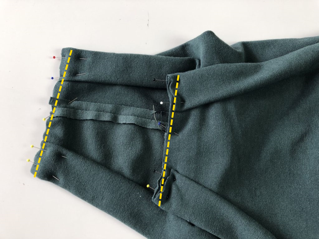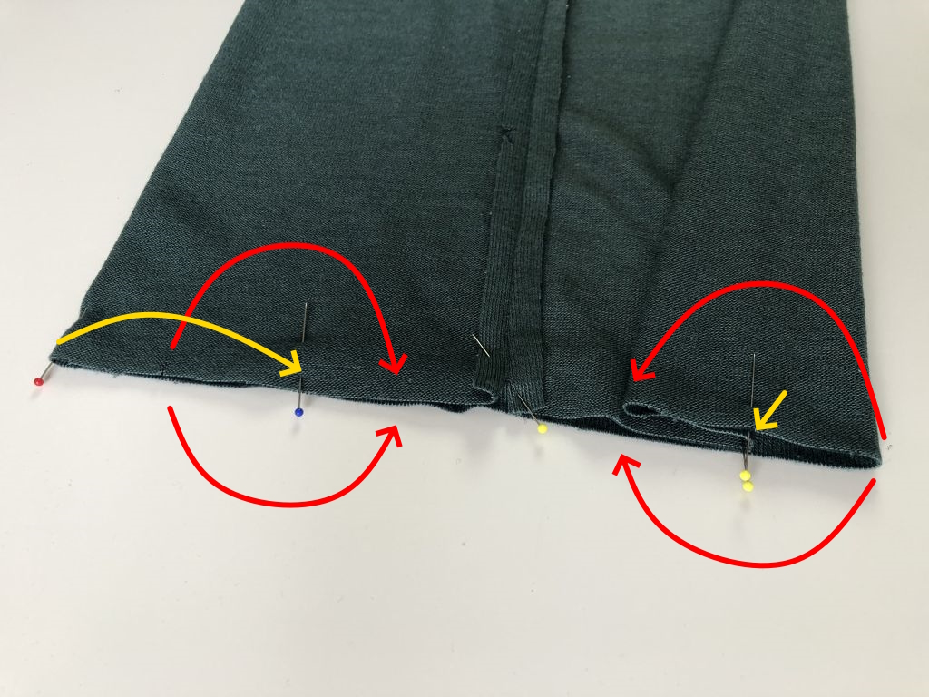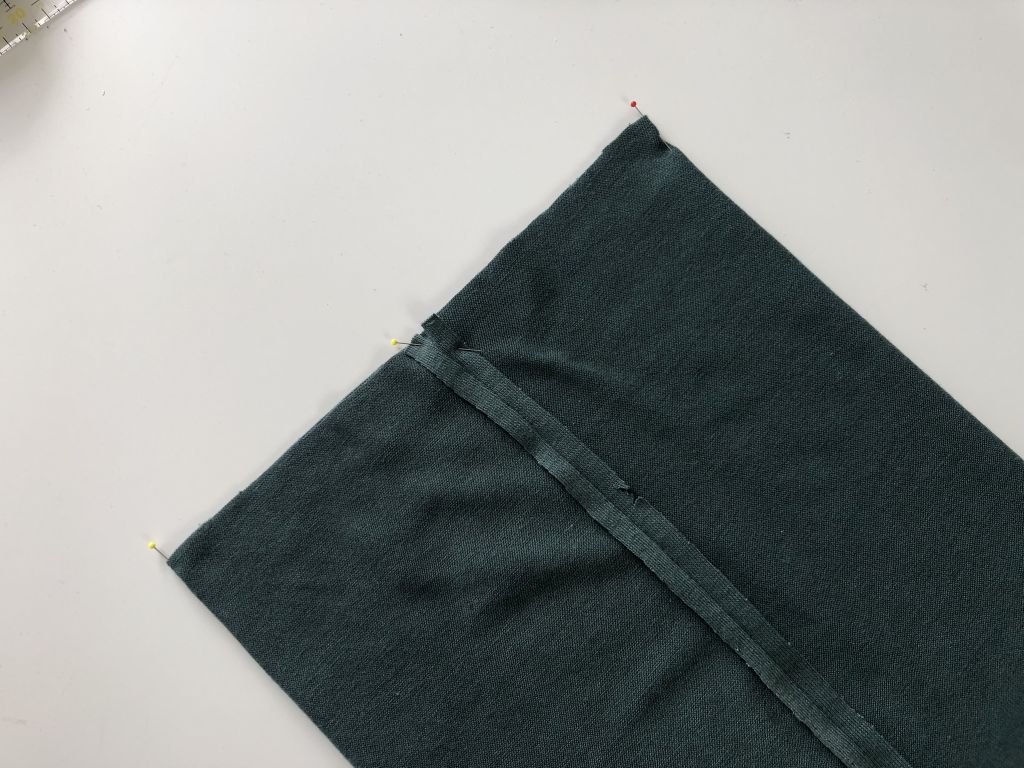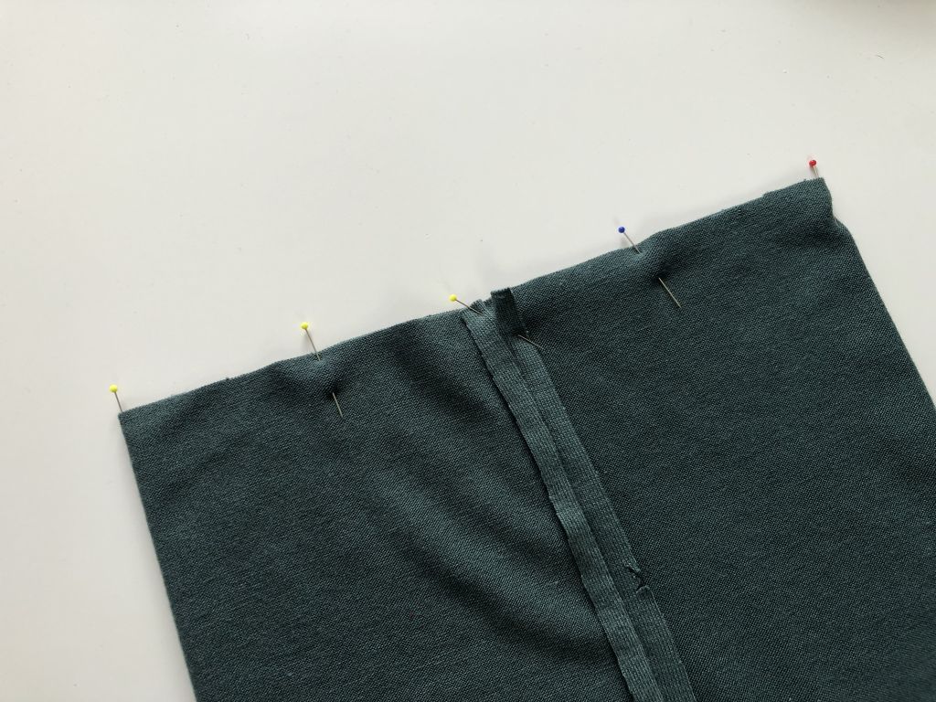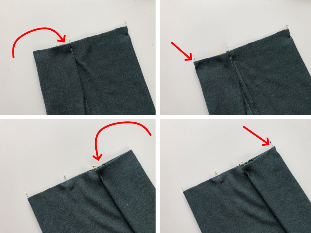 Levou hranu přeložíme kousek za střed a do vzniklého ohybu si píchneme špendlík. Pak pravou stranu přeložíme kousek za střed a opět si vzniklý ohyb označíme špendlíkem.