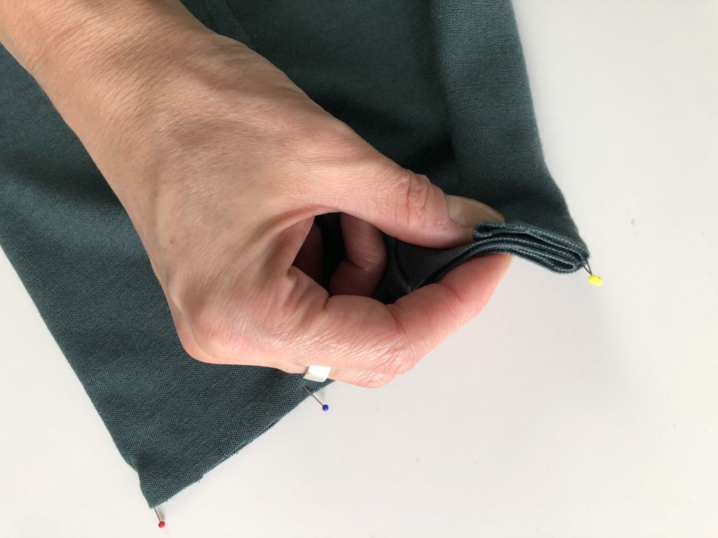 Horní vrstvu látky mezi krajními špendlíky uchopíme a složíme ji ke středu tak, aby si první špendlík lehnul na druhý. Zbytek látky na kraji ohneme kolem špendlíků ze spodní strany. Viz další fotka.