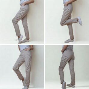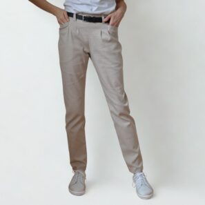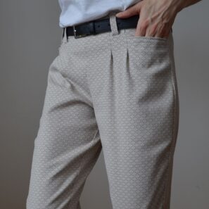 Ušijeme si pohodlné kalhoty z pružného materiálu. Primárním materiálem je Punto nebo jiný pevnější úplet, ale zvolit můžete i jakoukoliv jinou trochu pružnou látku. Kalhoty mají v zadní části pásku gumu, takže nás čeká jednoduché šití bez zapínání. V předu jsou dva záševky, kdy z jednoho přímo vychází kapsa. Pásek v přední části je hladký pro elegantní vzhled. Kalhoty jsou doplněny i o poutka na pásek. Nohavice se směrem dolů mírně zužují, délka je ke kotníkům. Věříme, že tento střih pro vás bude skvělým odrazovým můstkem pro ušití pohodlných kalhoty na běžný den i svátek.