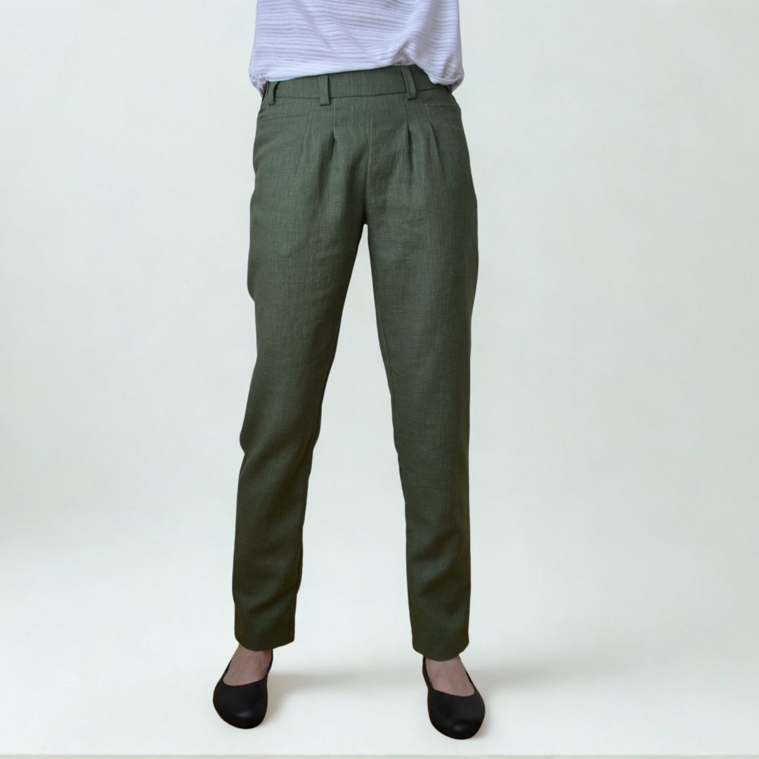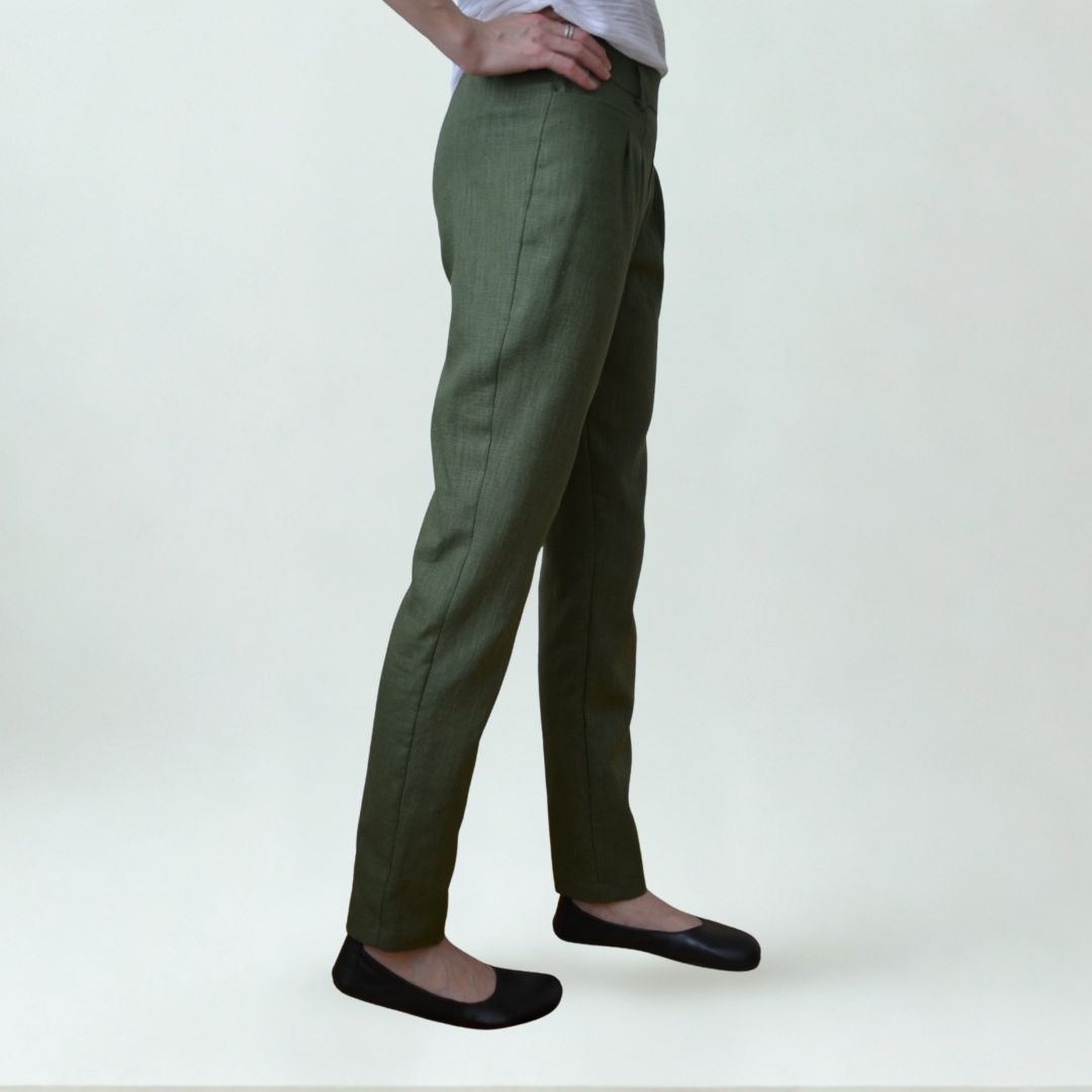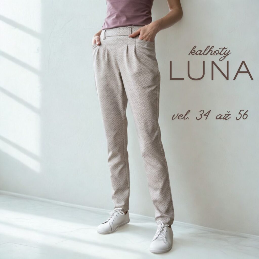 Zkoušely jsme je šít i z lněného plátna bez elastanu. I tento materiál lze použít, ale tam doporučujeme sáhnout po větší velikosti, aby se kalhoty dobře oblékaly. Dostaneme tak pohodlné letní kalhoty.