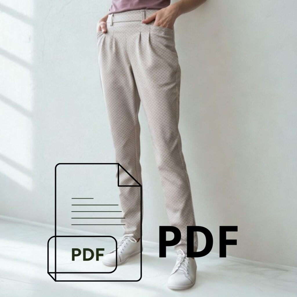 Ušijeme si pohodlné kalhoty z pružného materiálu. Primárním materiálem je Punto nebo jiný pevnější úplet, ale zvolit můžete i jakoukoliv jinou trochu pružnou látku. Kalhoty mají v zadní části pásku gumu, takže nás čeká jednoduché šití bez zapínání. V předu jsou dva záševky, kdy z jednoho přímo vychází kapsa. Pásek v přední části je hladký pro elegantní vzhled. Kalhoty jsou doplněny i o poutka na pásek. Nohavice se směrem dolů mírně zužují, délka je ke kotníkům. Věříme, že tento střih pro vás bude skvělým odrazovým můstkem pro ušití pohodlných kalhoty na běžný den i svátek.