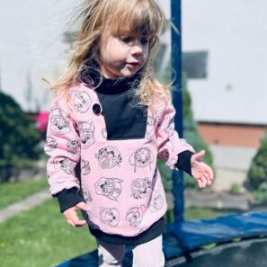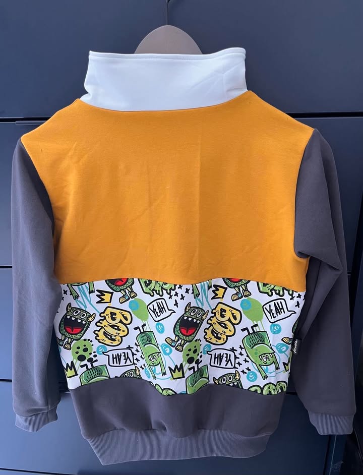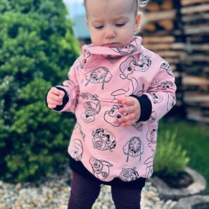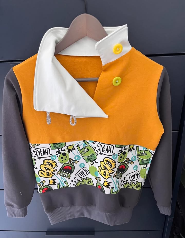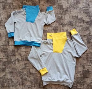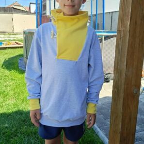 Ušijeme si dětskou mikinu pro malé frajery. Jedná se o mikinu přes hlavu, kdy límec je řešen do uříznutého véčka a má zapínání na dva knoflíky. Rukávy a spodní lem jsou zakončeny do nápletu. Mikča je trochu větší a volnější, tak s tím při výběru velikosti počítejte. Při vynechání límce můžete podle střihu ušít i basic mikinu přes hlavu. Střih je určen pro pružné materiály jako je teplákovina všeho druhu, silnější úplet, žebrovaný úplet, fleece, svetrovina apod.
