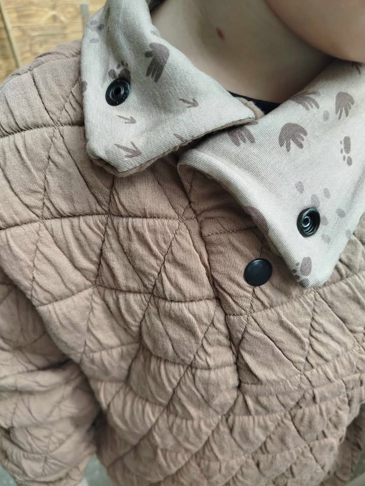 Střih je určen pro pružné materiály jako je teplákovina všeho druhu, silnější úplet, žebrovaný úplet, fleece, svetrovina apod. Potřebujemme tedy látku na mikinu. Jednobarevnou nebo vzorovanou teplákovinu. Kousek nápletu na lemy, šnůru na poutka a knoflíky nebo olivy.