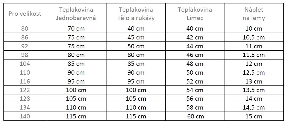 Pro jinou šíři látky je vhodné určit si spotřebu látky individuálně vyskládáním střihu na vaši šíři. V některých případech lze výrazně ušetřit.